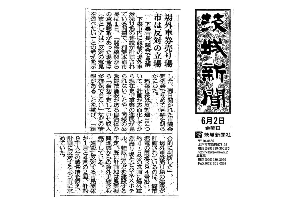 平成28年12月、新聞報道などにより国道294号沿いの下妻市堀篭地区に競輪の場外車券場建設計画が